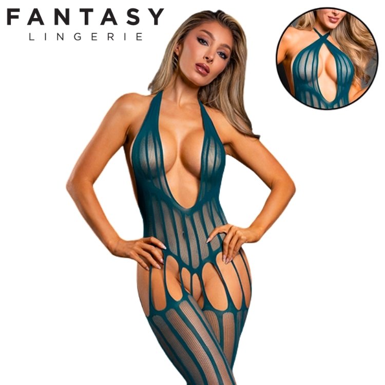 Bodystocking en mesh rayée avec un décolleté plongeant, un col versatile pouvant être porté croisé au cou ou col haut licou, à la fourche ouverte et des bas rayés assortis rattachées par des jarretelles élastiques multi-sangles. (G-string non inclus)