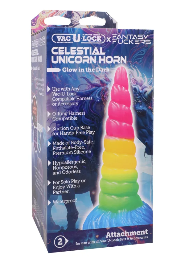 Conçu en silicone hypoallergénique, non poreux et sans phtalates, le Celestial Unicorn Horn offre un toucher soyeux et sécuritaire. Il est compatible avec tous les harnais O-Ring et les accessoires Vac-U-Lock, ce qui le rend parfait pour les jeux en duo.