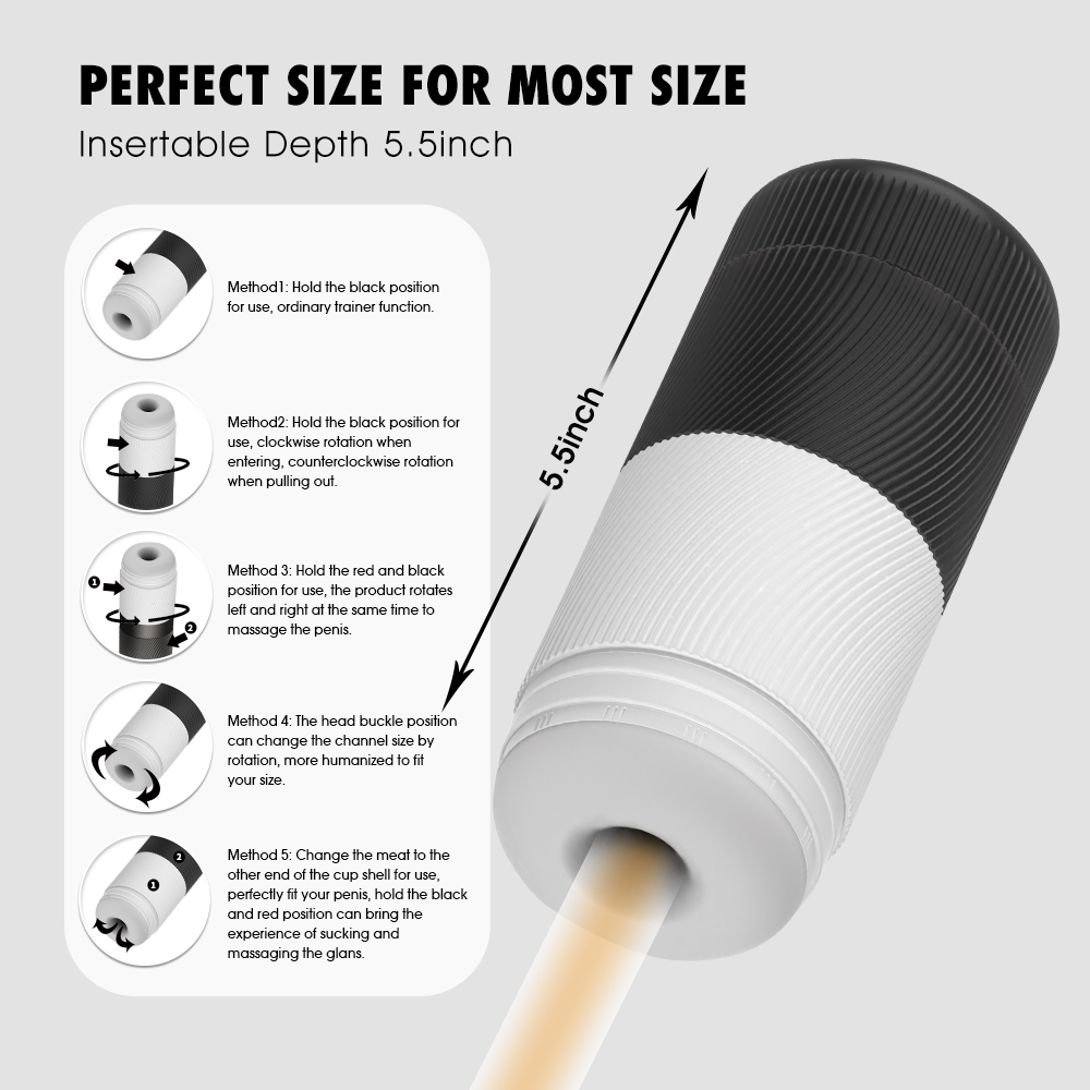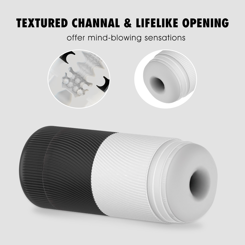 Grâce à son canal interne texturé et sa profondeur insérable de 5,5 pouces (14 cm), chaque mouvement procure une stimulation variée et enveloppante. L’ouverture réaliste et le tunnel à reliefs internes garantissent une expérience de succion et de massage inoubliable.