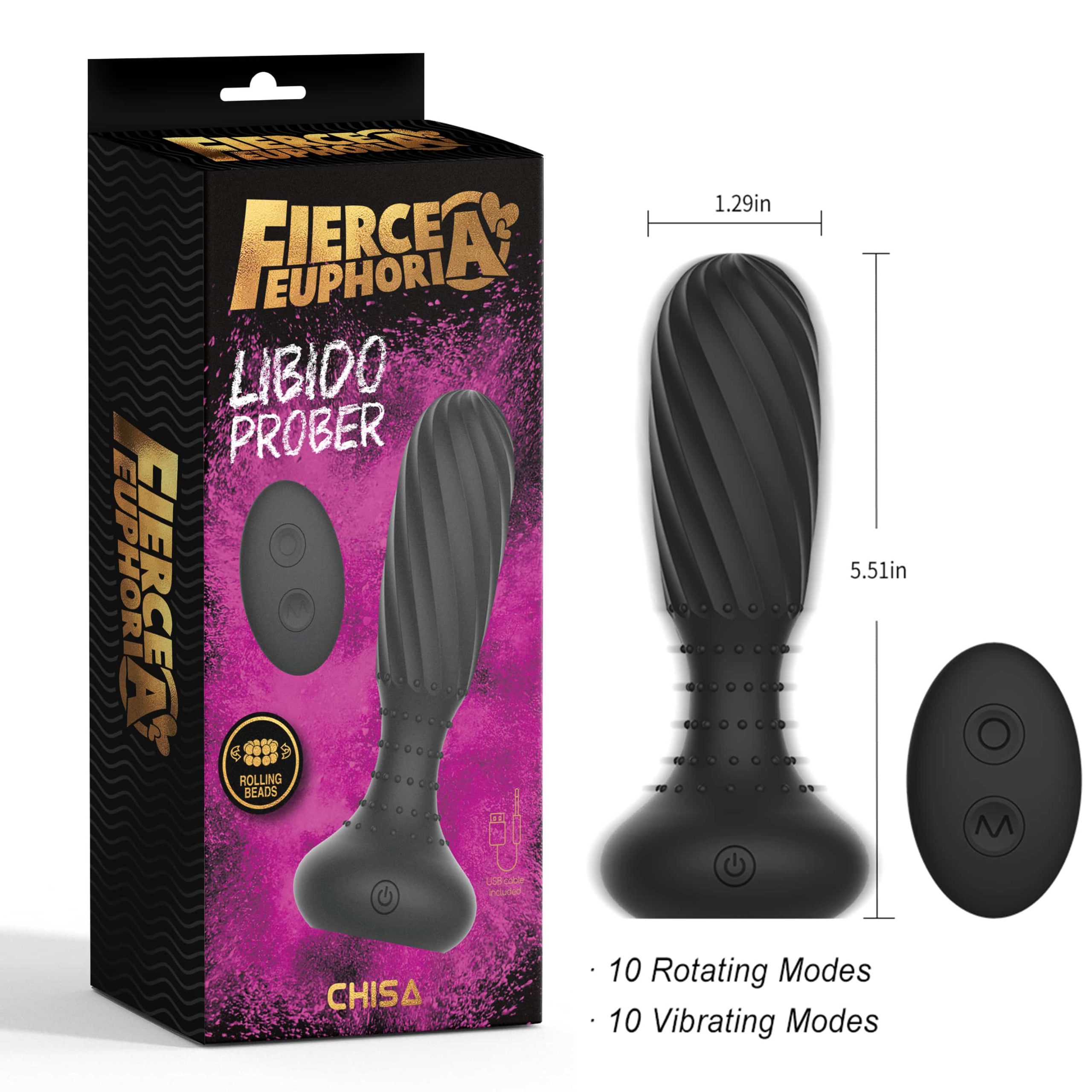 Libido Prober – Fierce Euphoria : sonde compacte en silicone avec billes roulantes à la base qui massent l’anneau anal pendant que l’embout tourne et vibre. Télécommande sans fil incluse, sans phtalates.