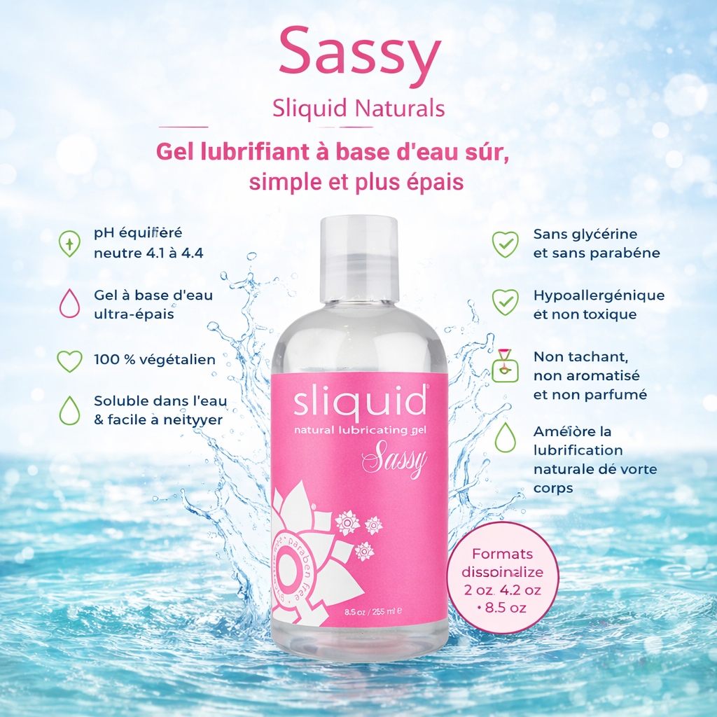 Sliquid Naturals Sassy est un gel lubrifiant intime à base d’eau pensé pour les personnes qui recherchent une texture plus dense que celle d’un lubrifiant liquide classique. Sa formule offre une consistance gel ultra-épaisse qui aide à réduire la friction et à augmenter le confort, tout en conservant les avantages d’un produit à base d’eau : facilité de nettoyage, compatibilité avec plusieurs matériaux et sensation plus naturelle.